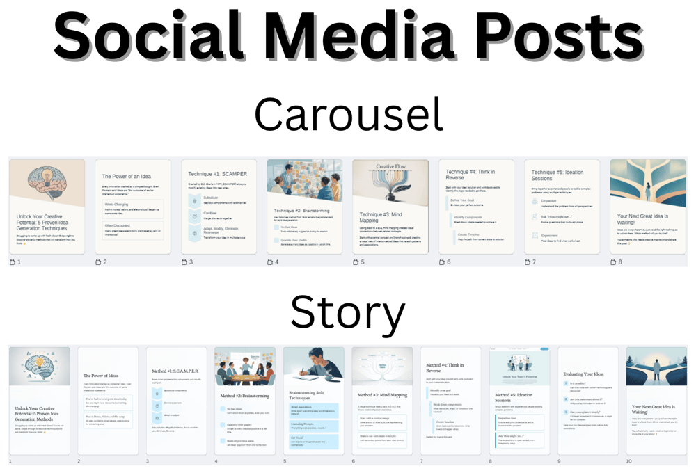 - 5 Proven Idea Generation Methods Give your audience comprehensive breakdowns of the most effective creative techniques from SCAMPER that systematically transforms existing concepts, to Brainstorming that unlocks rapid-fire creativity, to Mind Mapping that reveals unexpected connections. Your students will master each method and understand when to apply specific techniques for maximum results.